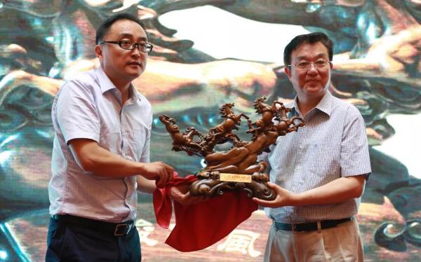 股份公司副總裁王衛(wèi)平代表公司向編委會致賀詞,并作為東道主回贈中西醫(yī)結合心腦血管病雜志編委會《八駿雄風》木雕禮品。