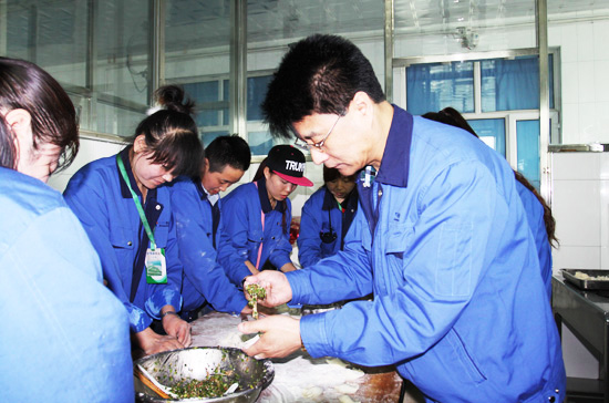 演出快要結束時,數(shù)十名志愿者又轉移到了廚房,開始包餃子,大家卷起袖子,搟皮的搟皮,包餡的包餡。公司領導莊總也與志愿者們一起投入到了包餃子的行列中。