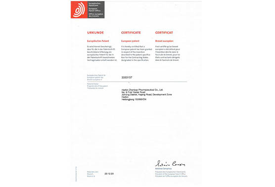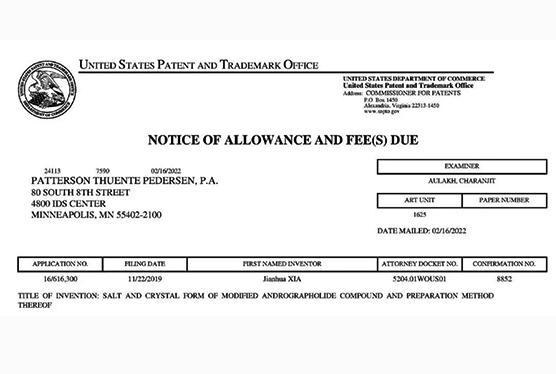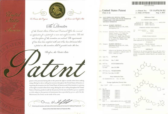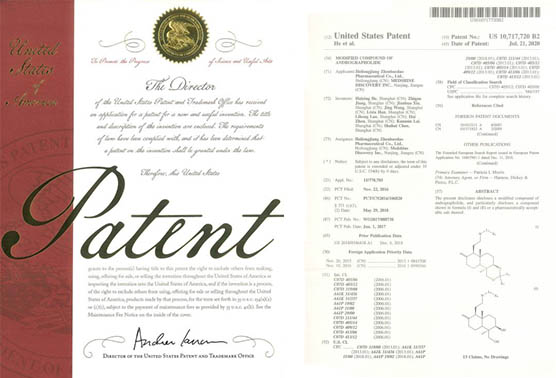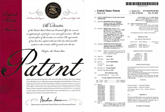 兩個(gè)在研創(chuàng)新藥的PCT專利申請?jiān)谥袊皻W洲同步審查中,《作為FGFR和VEGFR抑制劑的乙烯基化合物》已獲得美國、歐洲、日本授權(quán);《作為Akt抑制劑的二氫吡唑氮雜卓類化合物》已獲得美國、歐洲、日本、韓國授權(quán);《作為Akt抑制劑的鹽型及其晶型》已獲得美國、日本、韓國和歐盟授權(quán);《穿心蓮內(nèi)酯改構(gòu)化合物》獲得美國授權(quán);《一種穿心蓮內(nèi)酯改構(gòu)化合物的鹽型、晶型及其制備方法》獲得美國、歐洲授權(quán);《一種作為FGFR和VEGFR抑制劑化合物的鹽型、晶型及其制備方法》獲得美國和日本授權(quán)。